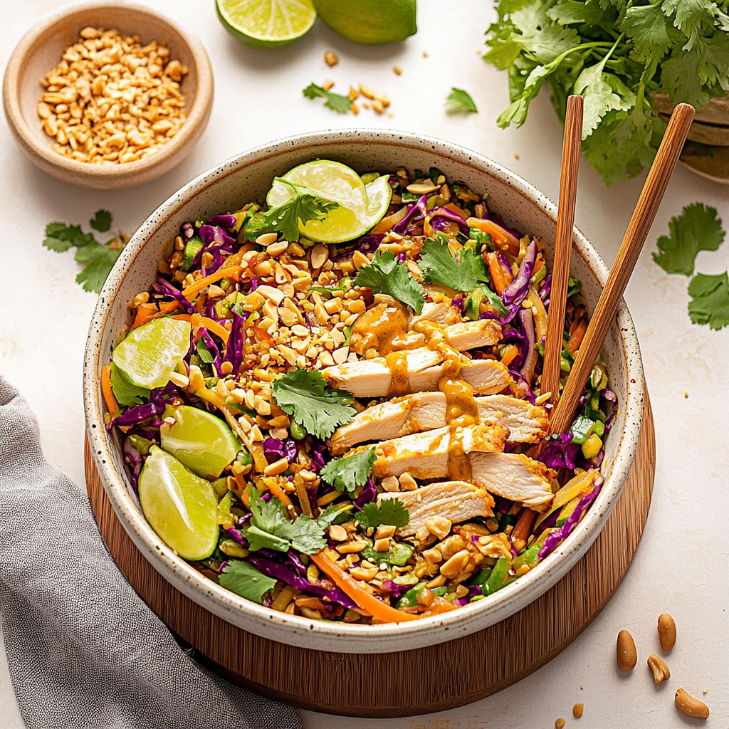 A vibrant, no-cook Thai-inspired salad with tender chicken, crisp cabbage, and fragrant peanut dressing. Balanced sweet, salty, and spicy flavors transport you to a Bangkok street market in 20 minutes or less.
